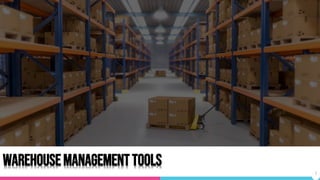 The document discusses warehouse management tools, detailing the various types of warehouses including bonded, public, smart, distribution, cross-dock, and private warehouses, along with their advantages and disadvantages. It also emphasizes the importance of warehouse location, operations, storage and material handling equipment selection, and advanced methods like cross-docking to enhance efficiency and reduce costs. Overall, it provides a comprehensive overview of the evolving warehouse landscape in the context of e-commerce and globalization.