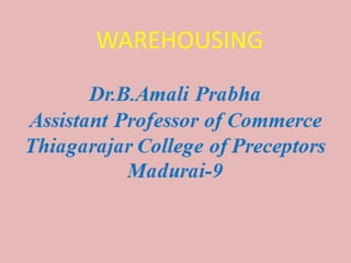 Warehousing involves the storage of raw materials, work-in-progress, and finished products in warehouses. Warehouses serve several important functions such as facilitating mass production and distribution, stabilizing prices, equalizing supply and demand, and providing business financing. There are various types of warehouses classified by ownership (private, public, etc.) and commodities stored (general, refrigerated, etc.). Warehousing provides advantages like safeguarding merchant stock, reducing distribution costs, and creating employment. However, it also faces drawbacks like inadequate transport and storage facilities.
