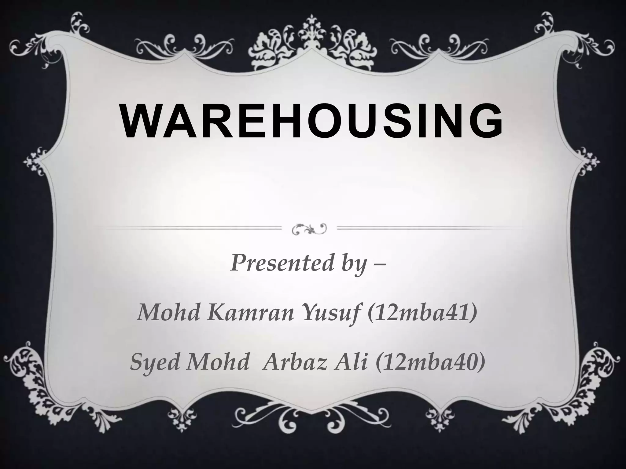This document provides an overview of warehousing. It defines warehousing as the storage of goods and preparation for reshipment. It describes the four main types of historical warehouses and notes that warehousing involves receiving, identifying, holding, assembling, and preparing goods to meet demand. The document outlines the types of warehousing including private, public, bonded, and government warehousing. It discusses factors to consider like ownership, location, size, and products. The functions of warehousing are receiving, record preparation, identification, storage, packing, and delivery. Benefits include consolidation, breaking bulk, processing, and storing goods to reduce costs.