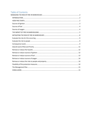 This document discusses managing the risk of fire in warehouses. It begins by explaining the fire triangle - the three elements (oxygen, heat, and fuel) needed for a fire to start. It then discusses potential sources of ignition, fuel, and oxygen in warehouses. The document outlines the impacts of warehouse fires, including property damage, business interruption, loss of jobs and tax revenue. It provides guidance on mitigating fire risks, including evaluating ignition sources and consequences, removing or reducing hazards, and developing a management plan. The overall goal is to help warehouse managers identify and reduce fire risks to protect property, operations, and people.