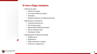 Документ содержит детальное описание архитектуры и технологий глобальной карты для игр, включая историю, игровые события, технологический стек и особенности оперирования. В нем представлены данные о количестве игровых провинций, танковых сражений и кланов на карте, а также информация о процессах расчета игрового хода и деплоя. Рассматриваются также вопросы надежности, мониторинга и сбора статистики.