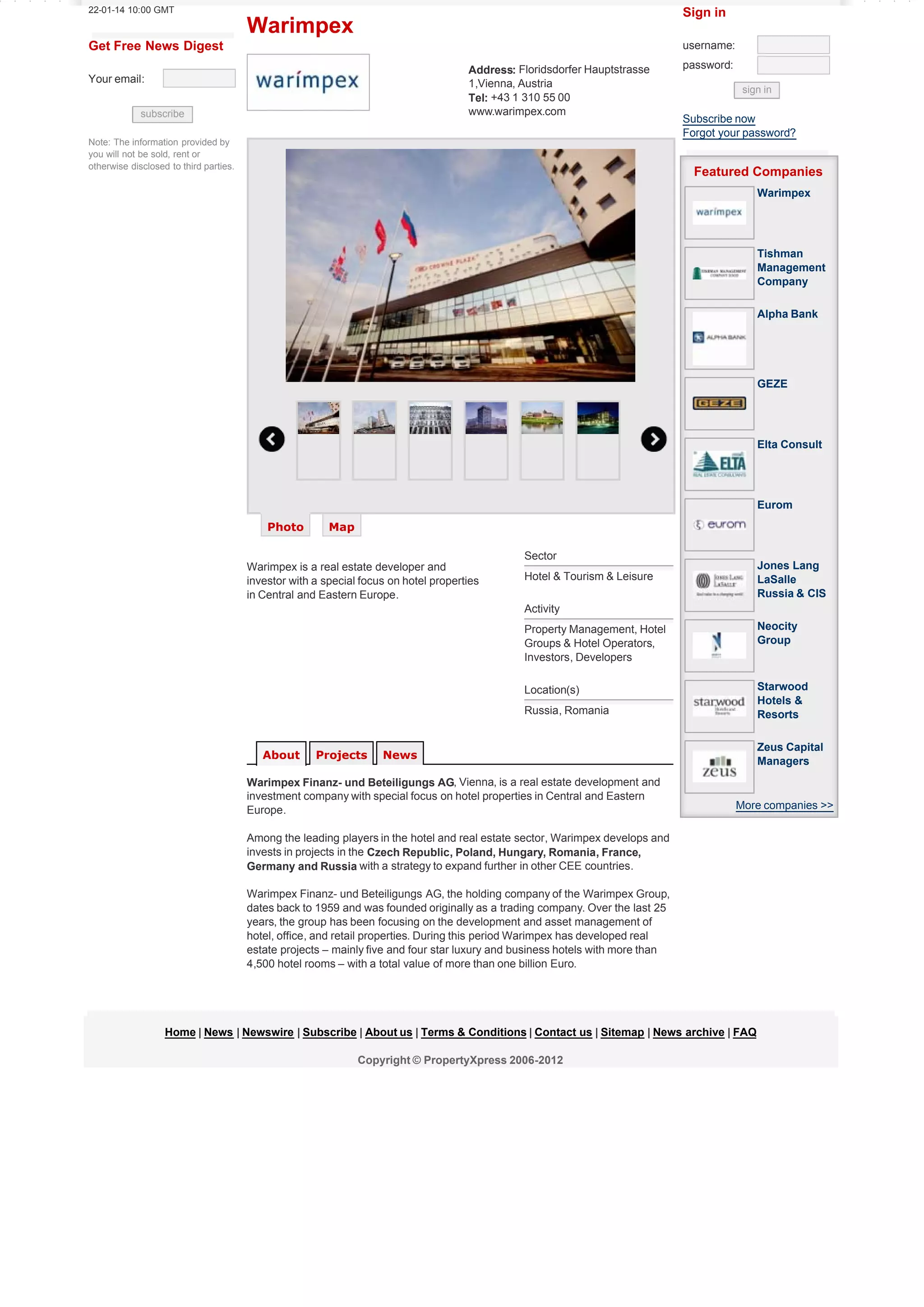 Warimpex is a real estate developer and investor focused on hotel properties in Central and Eastern Europe, active in countries like the Czech Republic, Poland, and Russia. Founded in 1959, the company has shifted its focus towards the development and management of luxury and business hotels, totaling over 4,500 hotel rooms with a project value exceeding one billion euros. Warimpex plans to further expand its portfolio in additional markets across Central and Eastern Europe.