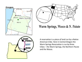 This presentation was created by 7th grade students to share their new knowledge about the Warm Springs Reservation in Central Oregon. It introduces the history and culture of the three tribes that live there - the Warm Springs, Northern Paiute, and Wasco tribes. Hundreds of years ago, these tribes lived throughout Central and Eastern Oregon but were forced onto a small reservation in 1855. This meant the tribes from different cultures and languages had to live together, which was difficult. While the tribes faced pressure to abandon their traditions, some cultural practices like "twining" grasses into ropes and baskets are still carried on today.