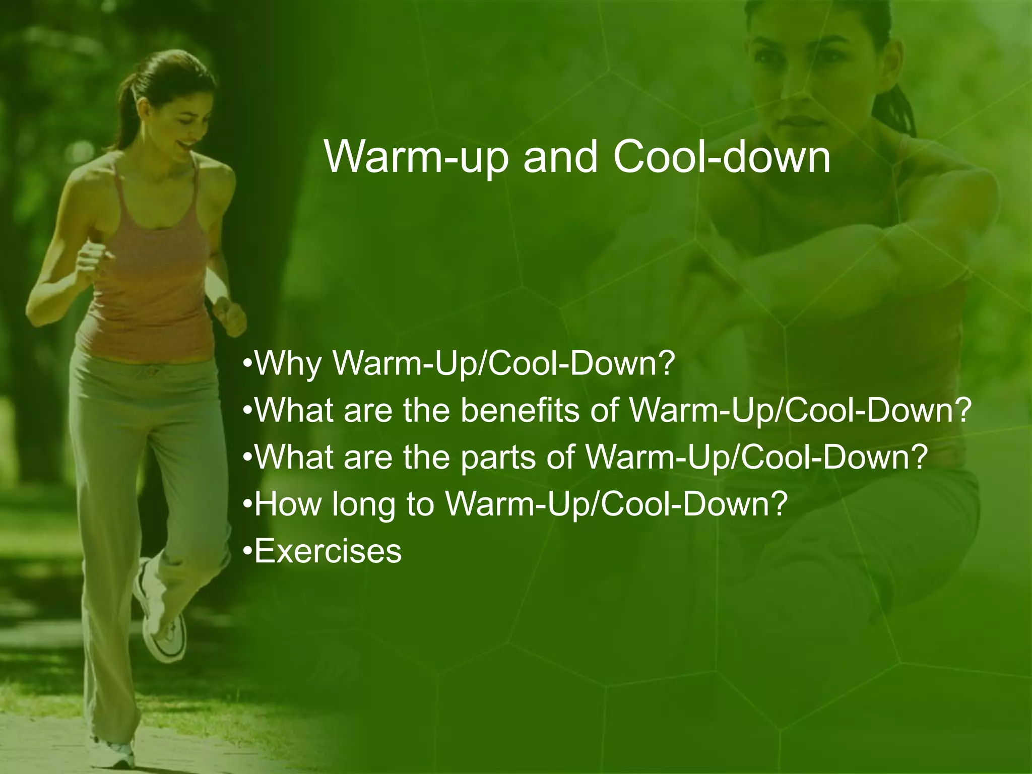 The document discusses the importance of warm-up and cool-down periods before and after exercise. It describes how warming up prepares the body for activity by increasing muscle temperature and flexibility. Cooling down helps the body return to its resting state and removes waste products from exercise. An effective warm-up includes general activities to raise the heart rate and dynamic stretches. Cool-downs should consist of light exercise and static stretching over 5-10 minutes. Both periods are important for injury prevention and recovery.