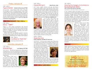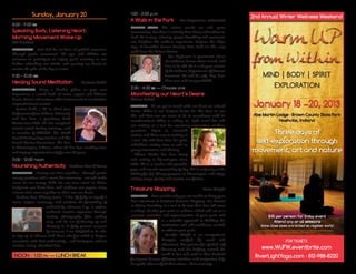 The document outlines the schedule for the 2nd Annual Winter Wellness Weekend, featuring a variety of activities including guided nature walks, sound healing sessions, and creative workshops focusing on personal exploration and wellness. Participants of all ages and abilities are invited to engage in sessions related to movement, art, and meditation, aimed at enhancing well-being and authenticity. The weekend, held in Brown County State Park, is supported by a grant from the local visitors and convention bureau.