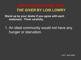 This document provides an anticipation guide and background information for the novel "The Giver" by Lois Lowry. It outlines statements for students to agree or disagree with to engage them in thinking about ideas presented in the book. It also gives biographical information about the author Lois Lowry, discusses themes in her writing, and shares reviews of "The Giver" praising Lowry's ability to provoke thought and questioning in her readers.