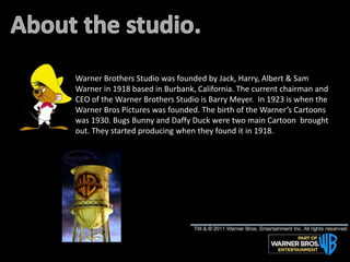 Warner Brothers Studio was founded in 1918 in Burbank, California by Jack, Harry, Albert and Sam Warner. The studio produces a variety of family-oriented films, including the Looney Tunes cartoons which were founded in 1930 and feature characters like Bugs Bunny and Daffy Duck. In 1924, their silent film The Marriage Circle was the studio's most successful film that year with a $212,000 budget, establishing Warner Bros. as the most successful independent studio in Hollywood at the time.