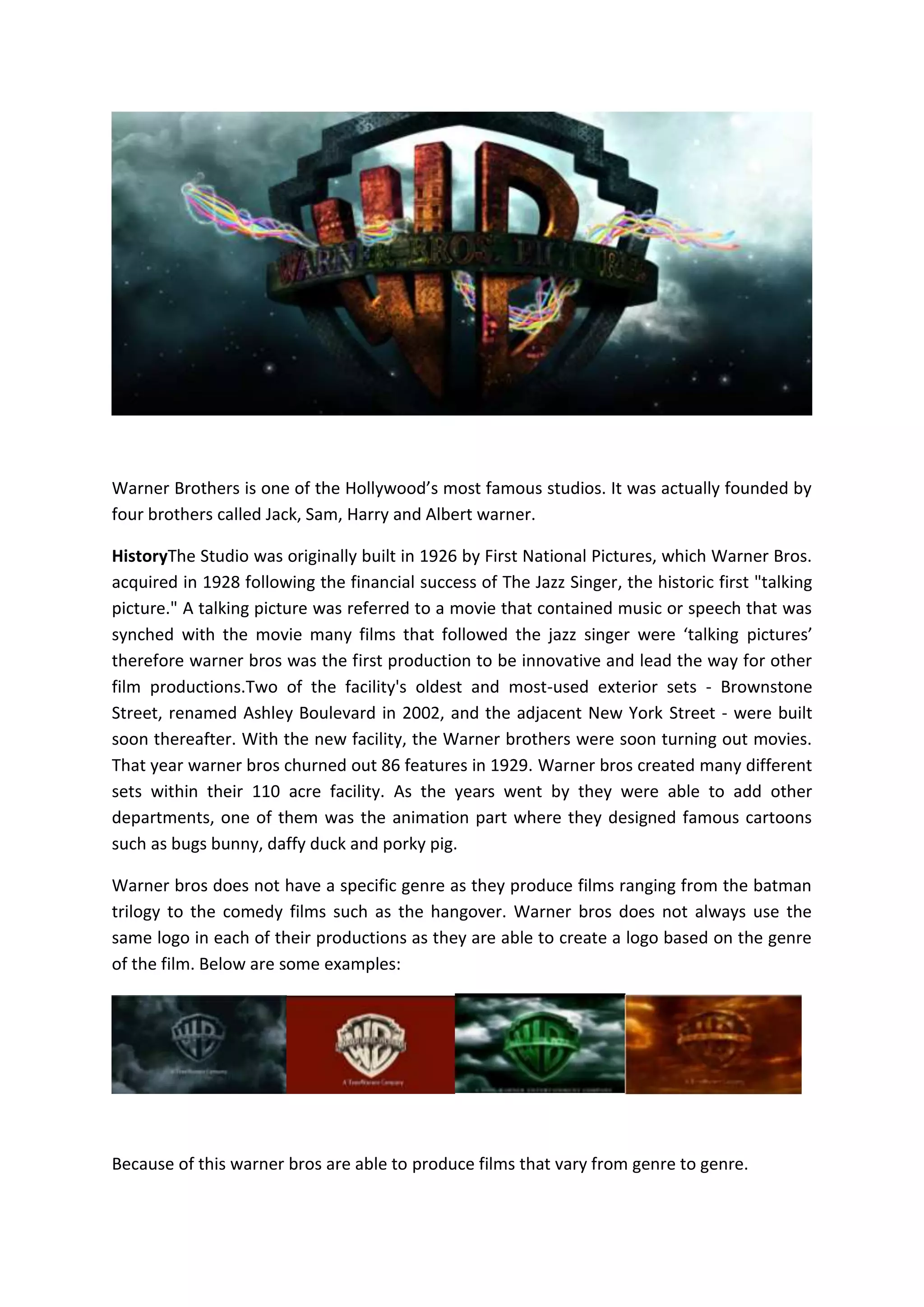 Warner Brothers is one of Hollywood's most famous studios, founded in 1926 by four brothers. It was the first to produce a "talking picture" called The Jazz Singer in 1928, pioneering synchronized sound in films. Warner Brothers built extensive sets on its 110 acre studio lot, producing 86 films in 1929, and became known for animated cartoons like Bugs Bunny and Daffy Duck. The studio produces a wide range of films across genres, from the Batman trilogy to comedies like The Hangover, sometimes altering its logo to suit different movies.