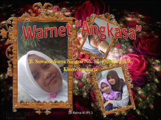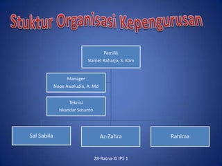 Organisasi perusahaan terdiri dari pemilik, manager, teknisi, dan karyawan. Layanan yang ditawarkan termasuk parkir gratis, tempat nyaman, webcam, headset, dan koneksi internet cepat. Grafik menunjukkan peningkatan jumlah pengunjung per tahun berdasarkan golongan anak sekolah, mahasiswa, dan umum dari tahun 2007 hingga 2009.