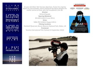 Warp Films is an independent UK film production company based in Sheffield and London with an office in Melbourne. Submarine is written by Joe Dunthorne and directed by Richard Ayoade in his debut film. It premiered at the 2010 Toronto International Film Festival. The film depicts the story of 15 year old Oliver Tate and his objectives to lose his virginity and disrupt his mother's relationship with an ex-lover. It was filmed in locations in Wales and had a limited release in the US in 2011.