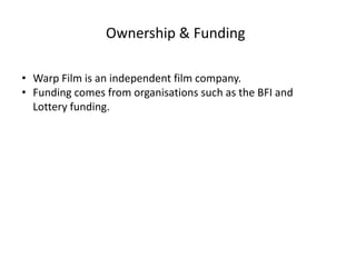 Warp Film is an independent British film company that receives funding from organizations like the BFI and lottery funding. It produces films through its record label Warp Records and music video division. Some of its most successful and acclaimed films like Submarine, This is England, and Four Lions were made with small budgets but went on to earn much higher box office totals and receive awards. However, some films like Bunny and the Bull and Grow Your Own were financial flops despite higher budgets. Warp Film's cross-media structure and funding from UK sources allow it to produce low-budget, unique British films that often find both critical and financial success.