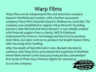 Warp Films and Working Title Films are two British film production companies that differ in several key ways. Warp Films is more traditionally British, producing films focused on domestic stories and audiences with less American influence. Working Title has stronger ties to American partners like Universal Studios and is known for bigger-budget films that appeal more broadly. Both companies started by producing short films that led to funding for feature-length productions. However, Working Title is now a larger company better able to utilize larger budgets for effects-heavy genres like sci-fi that Warp Films typically avoids for financial reasons.