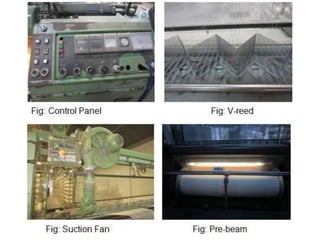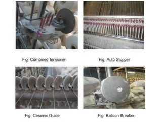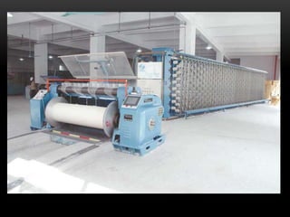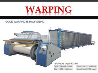 The document discusses different types of warping processes and machines. It describes beam warping, sectional or patterned warping, and ball warping. Beam warping is direct warping that produces beams with up to 1000 ends, while sectional warping is indirect and produces narrow tapes that are later rewound onto a beam, allowing for complex patterns. High-speed warping machines directly wind ends onto a beam from many packages at once. Sectional warping machines first wind yarns onto a drum before rewinding them onto a beam, enabling fancy multi-colored fabrics. Both processes aim to produce a warp beam with uniformly spaced, tensioned ends of a predetermined length.