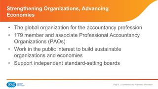 IFAC is a global organization representing the accountancy profession, focusing on building sustainable organizations and economies through capacity building and collaboration with member bodies and stakeholders. The document highlights efforts to strengthen professional accountancy organizations (PAOs) in underdeveloped nations, particularly in Africa, emphasizing the need for competency and quality in financial information. Additionally, it outlines partnerships with various development agencies to enhance global accountability, transparency, and adherence to accounting standards.