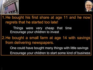 Warren Buffet, the second richest man in the world who has donated $31 billion to charity, advocates for a simple lifestyle. He still lives in the same small house he purchased over 50 years ago, drives his own car, and does not have security or attend high society events. Despite owning Berkshire Hathaway, one of the largest companies in the world, he communicates with CEOs through only one annual letter and two clear rules focused on not losing shareholder money. His advice is to invest in yourself through starting businesses, avoid unnecessary purchases, and enjoy a debt-free life focused on helping others.