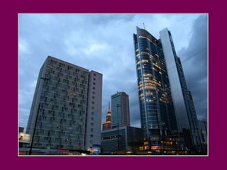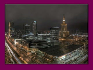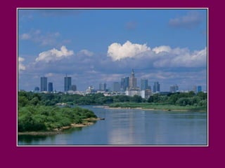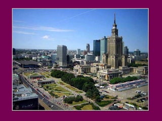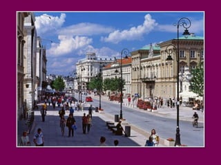 Warsaw is the capital of Poland that blends modernity with history and tradition. It is pleasant to walk through the Old Town alleys and along the Vistula River boulevards or relax in the parks among singing birds. Warsaw contains contrasts with quiet old town streets next to modern skyscrapers, and hidden small houses among the high-rise buildings. The document invites the reader to take a stroll through downtown Warsaw and highlights some of the architectural landmarks like the Palace of Culture and Science, historic churches, and parks.