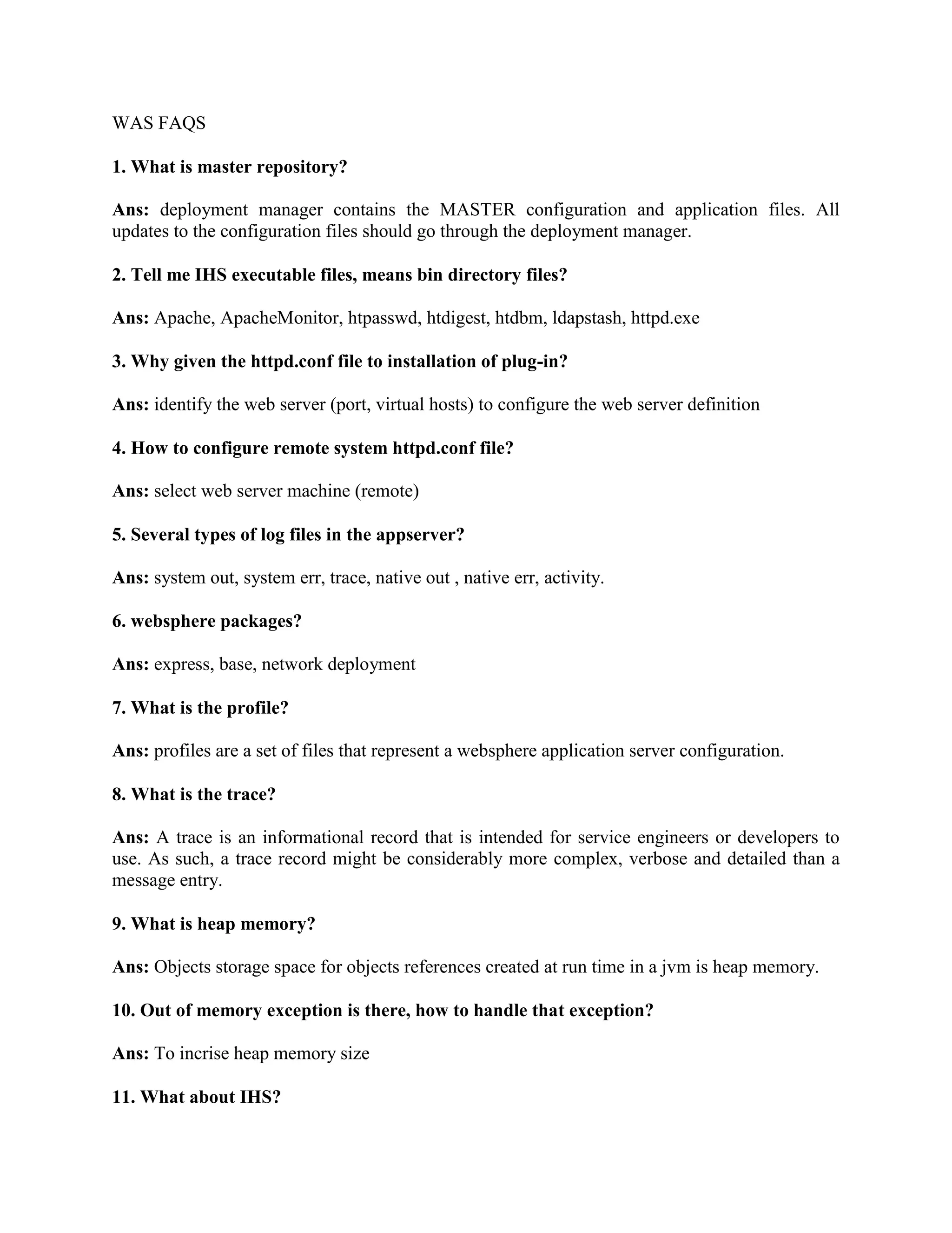 The document contains answers to frequently asked questions about WebSphere Application Server (WAS). It defines terms like the master repository, IHS executable files, log files, profiles, heap memory, plug-ins, global security, SSL, and PMI. It also provides information on starting servers, adding nodes, the differences between various WAS releases and components, and troubleshooting application issues.