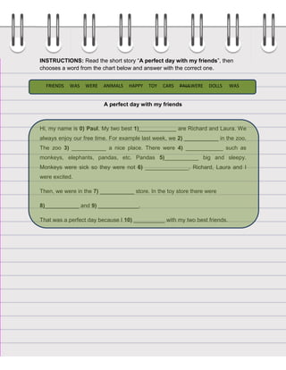 The document provides instructions and examples for identifying whether the correct form of "to be" is "was" or "were" in different sentences. It then provides a short story and asks the reader to choose the correctly corresponding word from a word bank to fill in blanks in the story. The story is about a boy named Paul spending time with his two best friends Richard and Laura at the zoo and a toy store, having an enjoyable day.