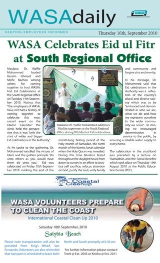 The document provides details about WASA's (Water and Sewerage Authority) first Eid ul Fitr celebrations at their South Regional Office. Maulana Dr. Waffie Mohammed praised WASA employees for coming together to host the celebrations, noting it was the start of wider Eid celebrations in the Authority. Dr. Mohammed spoke about the virtues of Islam. The celebrations marked the end of Ramadan and included a prior lecture on the social benefits of Ramadan. The document also announces that WASA volunteers will help clean Salybia Beach as part of the International Coastal Clean Up on September 18th.