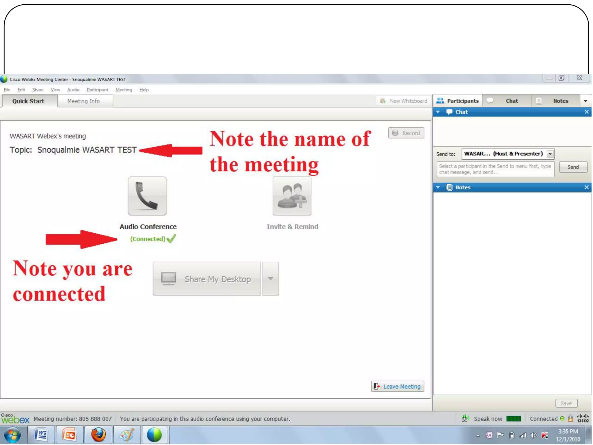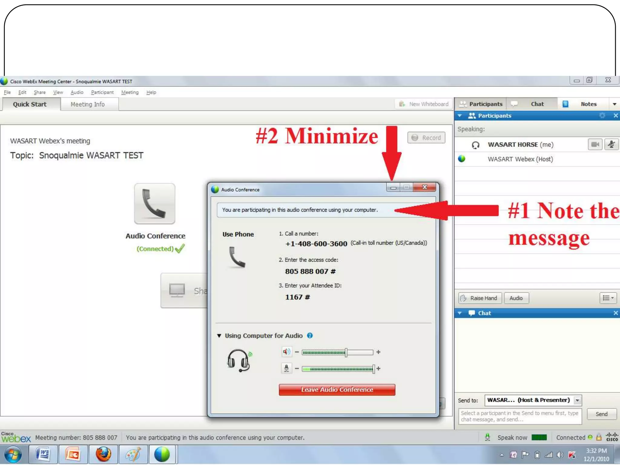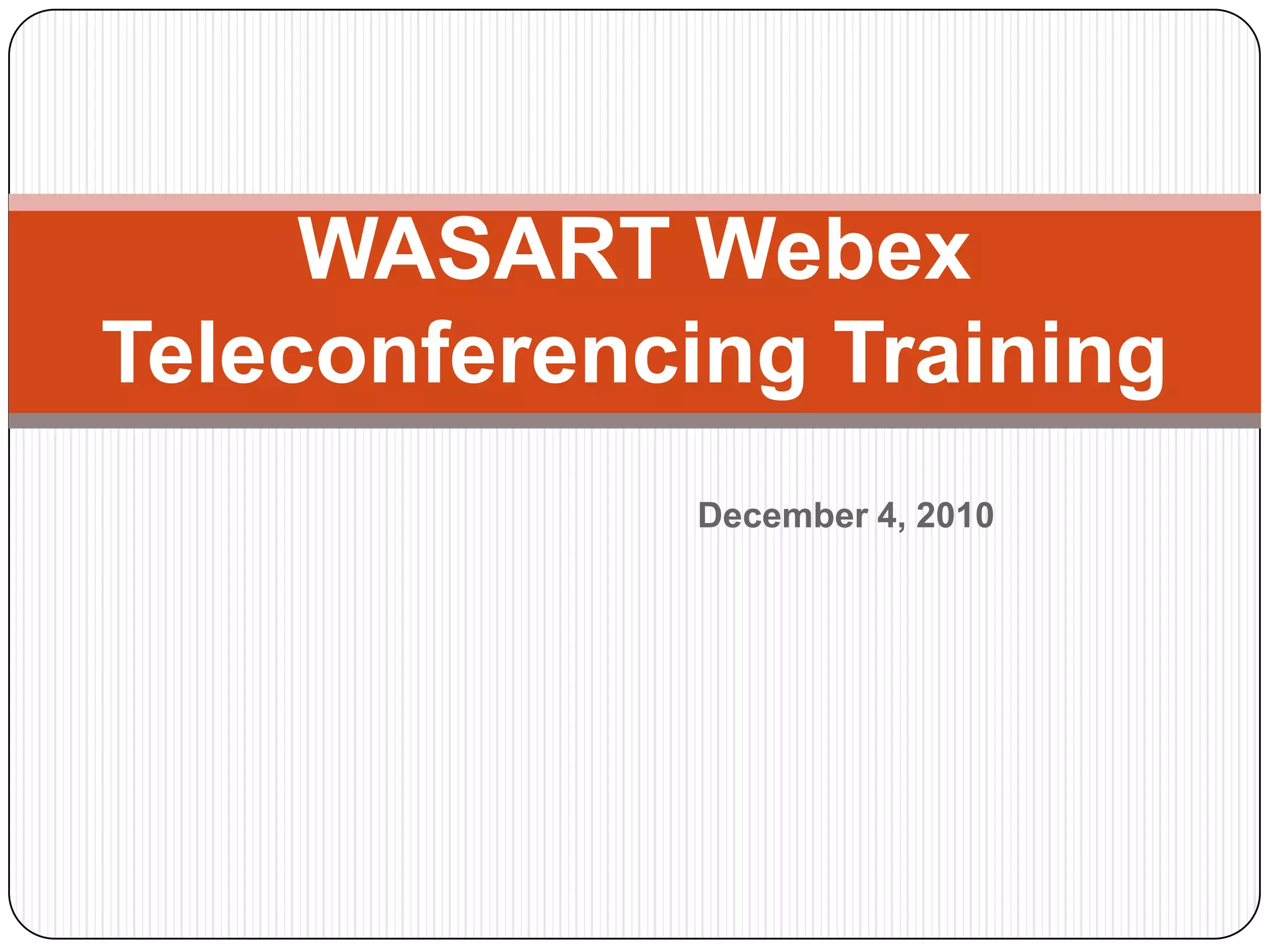This document provides information about Webex teleconferencing software and how to use it for a WASART training meeting. Webex allows multiple participants to join an online meeting to share screens, documents, and applications. It also provides features like chat, annotation tools, and recording. The summary outlines the minimum system requirements and steps to download the Webex software, join a meeting, and get help during a meeting.