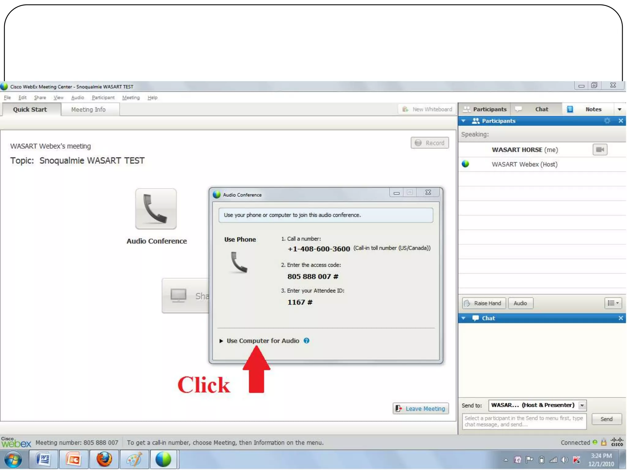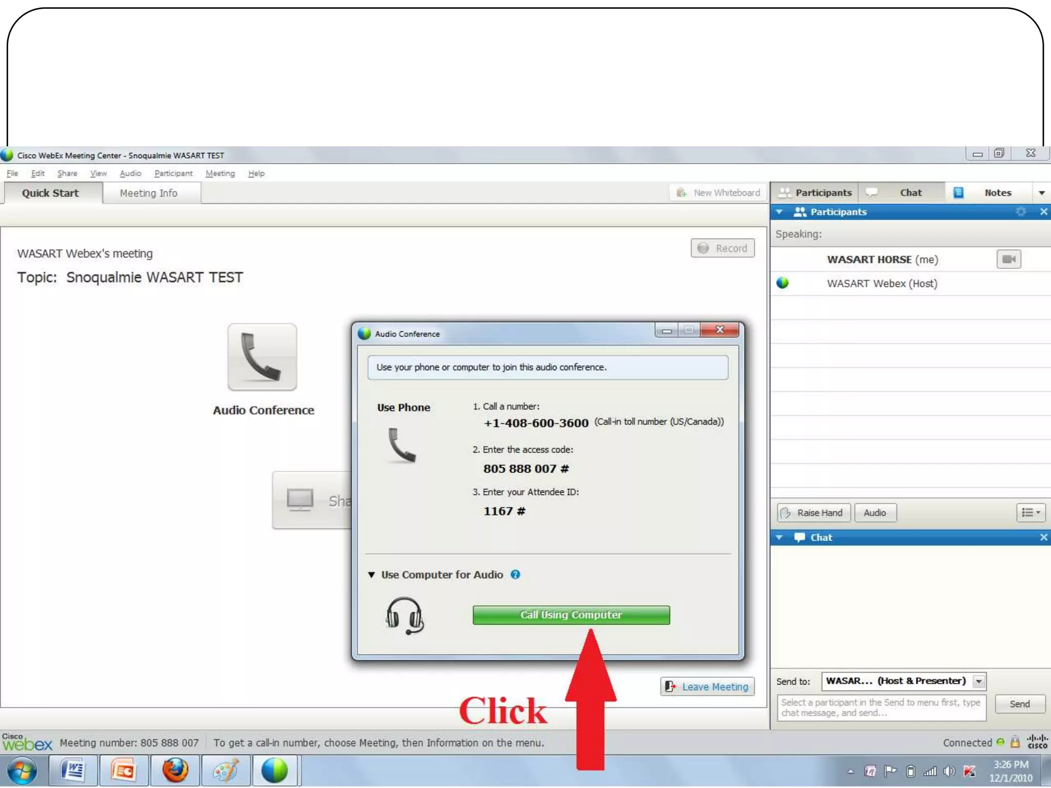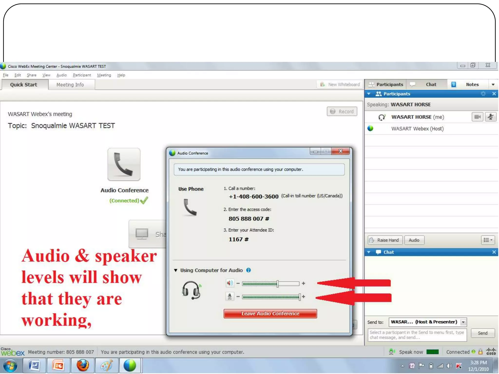 This document provides information about Webex teleconferencing software and how to use it for a WASART training meeting. Webex allows multiple participants to join an online meeting to share screens, documents, and applications. It also provides features like chat, annotation tools, and recording. The summary outlines the minimum system requirements and steps to download the Webex software, join a meeting, and get help during a meeting.
