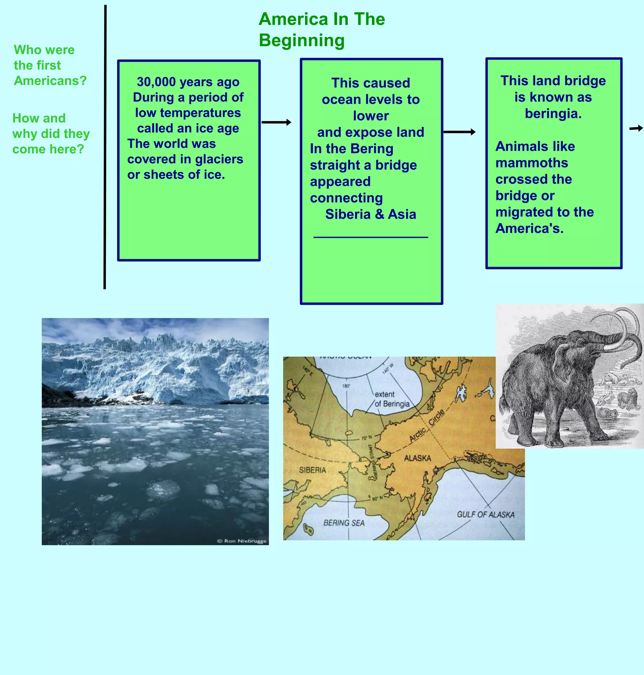 The first Americans crossed into North America from Asia over 30,000 years ago via a land bridge that connected Siberia to Alaska during an ice age. As the climate warmed, sea levels rose and the bridge disappeared under water. These early peoples adapted to different environments across North America by developing diverse cultures and ways of life, such as building shelters from local natural materials and hunting or gathering available food sources. However, they also shared some common beliefs like respecting nature and not owning land.