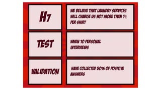 This document outlines a validation process for testing hypotheses. It presents an initial hypothesis and impact matrix to evaluate 11 hypotheses based on the potential impact if invalid and the probability of being invalid. The impact and probability are rated on a scale from very low to very high. The document aims to iteratively test and refine an initial hypothesis through validating additional hypotheses.