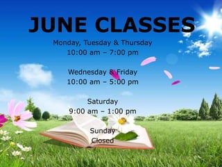 The document provides information about classes and events happening in June at various locations in Washington County. There are classes for children, teens, adults, and families on topics like dance, crafts, summer reading, and more. Class times and locations are listed. The Board of Trustees meeting for the Washington County Public Library is also announced for June 20th at 5:30 pm with information provided about public participation.