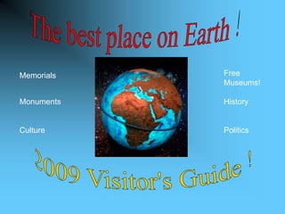 The document provides a comprehensive guide to touring Washington D.C., detailing the various memorials, museums, and historical sites such as the White House, Capitol, and Arlington National Cemetery. It outlines tour request procedures, transportation options including Metro and tour buses, and offers tips for accessing popular attractions. Additionally, it highlights the importance of early ticket acquisition for high-demand sites like the Washington Monument and provides links for further information.
