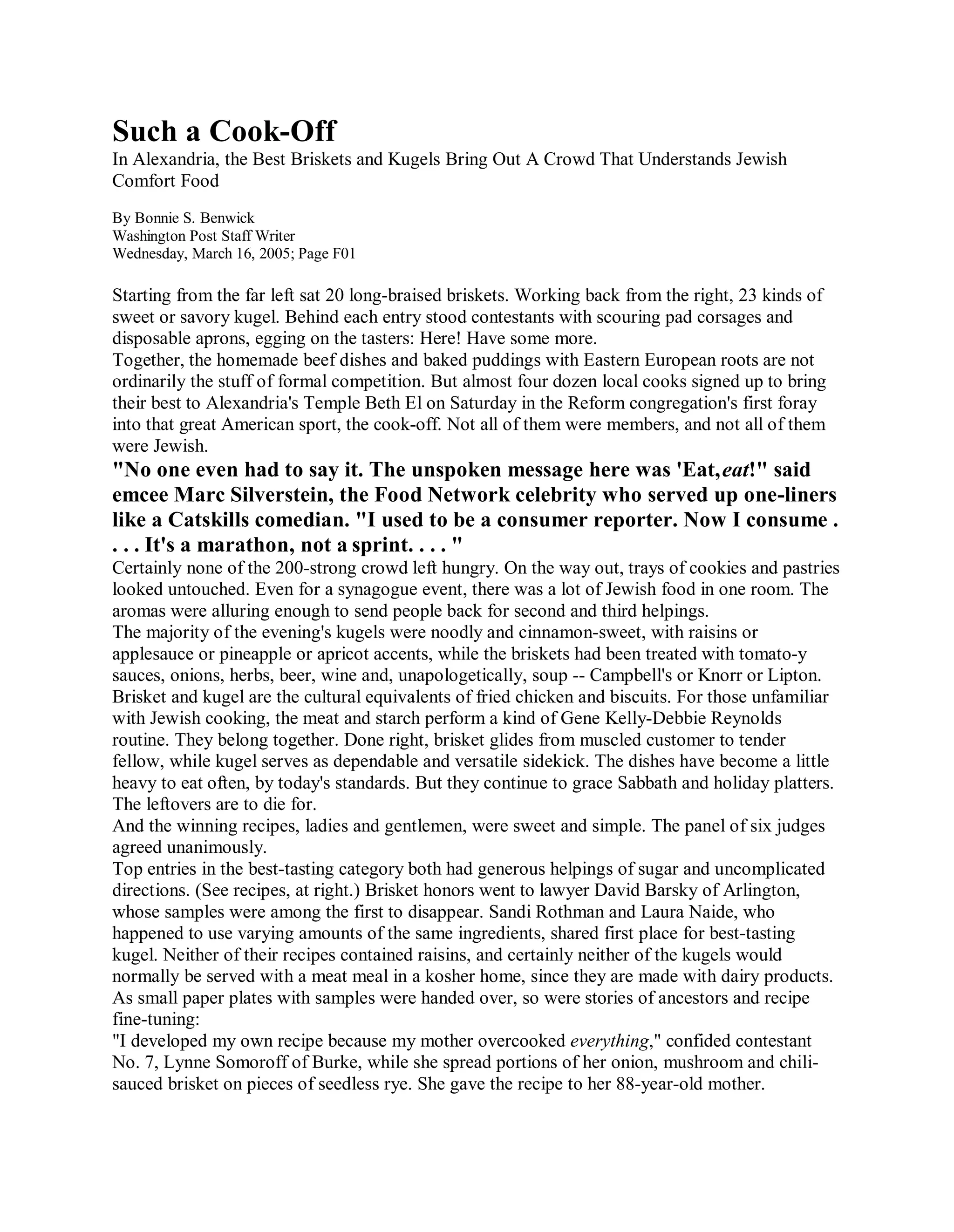 3) The winning recipes for best tasting brisket and kugel were simple, using generous amounts of sugar and uncomplicated directions.