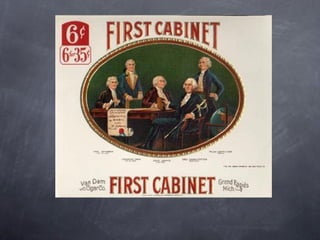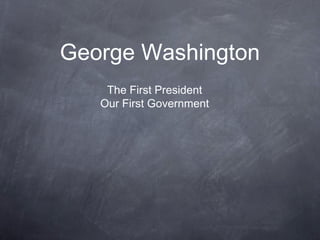 George Washington was unanimously elected as the first President of the United States in 1789. He assembled the first cabinet and helped establish important precedents, such as a two-term presidency and the use of a cabinet of advisors. During his presidency, he issued a Neutrality Proclamation in response to the French Revolution and used a militia law to put down the Whiskey Rebellion in western Pennsylvania, establishing the power of the new federal government.