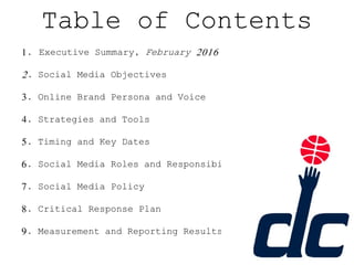 The social media strategy document outlines the Washington Wizards' plan to grow their online fan base and drive more traffic to their website through engaging social media content in 2016. The key objectives are to increase social media followers and engagement, share more visual content, and increase website traffic by 30% over five months. Major strategies include boosting popular posts, promoting hashtags, and creating a video series featuring star player John Wall surprising fans. Progress will be measured through analytics on social channels, website traffic sources, and hashtags used by fans.