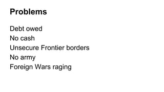 The document details the numerous challenges faced during George Washington's presidency, including debt issues, political factions led by Hamilton and Jefferson, and conflicts with Native American nations. It highlights key financial strategies such as Hamilton's plans for debt assumption and taxation, as well as the significant political divisions these strategies created. Washington's farewell address warns against regionalism, political parties, and foreign alliances, while John Adams' presidency encounters foreign conflicts and the controversial Alien and Sedition Acts.