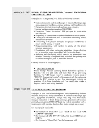 The curriculum vitae summarizes Wasi Sami's professional experience and qualifications. He has over 10 years of experience in civil engineering and structural design projects for oil and gas companies. He is currently employed as a Project Engineer at Pakistan Arab Refinery Company Limited, where he is responsible for design review, engineering inputs, and project coordination. Previously he has worked for DESCON Engineering Limited, Zishan Engineers, ENAR Petrotech Services, and Alliance Consultants on various civil and structural design projects for industrial facilities, commercial buildings, and residential complexes. He holds a Master's degree in Engineering Management and a Bachelor's degree in Civil Engineering from NED University of Engineering and Technology.