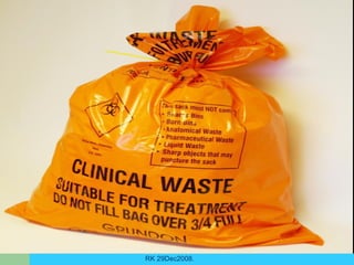 The document discusses waste management in dentistry. It defines waste management and categorizes different types of waste produced in dental practices, including clinical waste, cytotoxic waste, radioactive waste, and general waste. It outlines regulations from governing bodies like OSHA, EPA, CDC, and ADA regarding safe and proper waste handling and disposal. The document provides guidance on managing different categories of dental waste like sharps, infectious waste, amalgam waste, and contaminated laundry according to best practices.