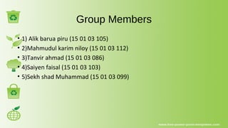 The document outlines a group's study on waste management in the Palashi area of Dhaka, which has about 50,000 residents. It describes the local waste collection process, the types of waste bins used, and highlights environmental issues such as landfill depletion and pollution caused by poor waste management. The document also suggests solutions like the 3Rs (Reduce, Reuse, Recycle) to mitigate these issues.