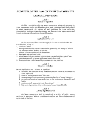 This document is a summary of the Law on Waste Management published in the Official Gazette of the Republic of Macedonia. It establishes regulations for waste management plans and programs, rights and responsibilities related to waste handling, and monitoring. Key principles include avoiding and reducing waste, reuse and recycling, environmental protection, proximity of waste processing, universality of waste services, polluter pays, and deposit systems for certain products. The law defines various waste types and terms related to waste handling, processing, storage and disposal.