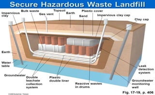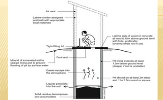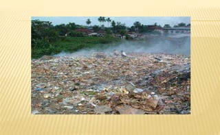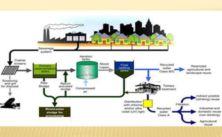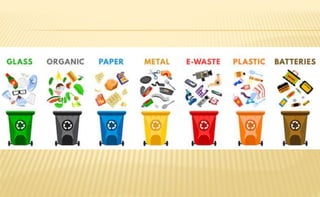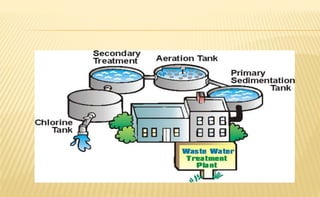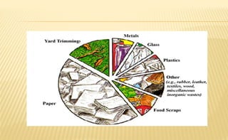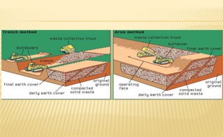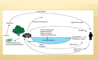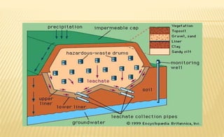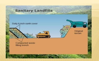 This document discusses sanitary waste disposal and management. It describes different types of wastes including solid and liquid wastes from houses, industry, and hospitals. It then discusses various methods for disposal of solid waste such as open dumping, landfilling, incineration, recycling, reuse, and composting. For liquid waste disposal, it covers collection systems, treatment including screening and sedimentation, and disposal through dilution or irrigation. It also addresses management of hazardous, electronic, and radioactive wastes. Control of insects, rodents, and foodborne illnesses are additionally discussed.