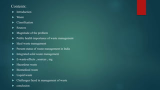 This document provides an overview of different types of waste, sources of waste, and approaches to waste management. It discusses solid waste, liquid waste, hazardous waste, biomedical waste, and e-waste. For each type of waste, it outlines generation sources, health and environmental impacts, and management strategies like reduction, collection, treatment and disposal. It notes that waste management in India faces challenges like lack of segregation, expertise, funding, and community participation. Proper waste handling requires coordinated efforts from individuals, local governments and improved infrastructure.