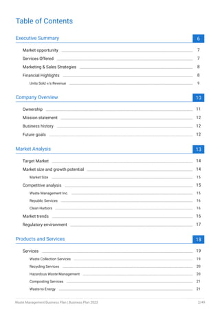 The document is a business plan for a waste management company outlining its market opportunities, services, and operational strategies. It details the company's mission, financial highlights, competitive analysis, and marketing strategies while providing insights into the waste management industry and its regulations. Key sections include an executive summary, company overview, market analysis, and a description of products and services offered.