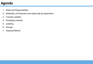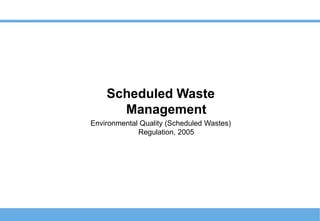 This document provides guidelines for managing scheduled waste at a company in accordance with the Environmental Quality (Scheduled Wastes) Regulation, 2005. It outlines roles and responsibilities, requirements for notification, inventory, packaging, labelling, storage, and disposal of scheduled waste. The waste management manager is responsible for ensuring proper management of scheduled waste, while waste generators must notify, inventory, package, label, store, and dispose of waste appropriately. All scheduled waste must be disposed of at prescribed premises or rendered innocuous prior to disposal.
