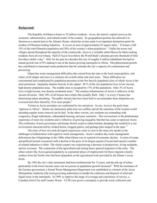 This document summarizes domestic waste management strategies in Accra, Ghana. It discusses the current approaches used, which include privatization of waste collection, controlled dumping, composting, recycling, and incineration. However, these approaches have been inadequate due to rapid population growth, poor infrastructure, and unequal waste collection between high- and low-income areas. This has led to environmental health risks like diseases from improper waste disposal. The most vulnerable populations bear the greatest risks. Improved governance and enforcement of laws is needed to effectively address Accra's growing waste management challenges.