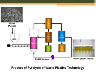 Waste to fuel technologies convert waste into energy sources like fuel. Common methods include incineration which burns waste to create steam and generate electricity, though it risks polluting air. Alternative technologies like pyrolysis heat waste in low-oxygen environments to produce synthetic fuels without combustion. Two students developed a pyrolysis process that cracks plastic molecules at high temperatures and pressures using a catalyst to produce crude oil, gasoline, diesel and kerosene. Their process was certified after analysis showed it converted plastic waste into 80% hydrocarbon oil fuel. Waste to fuel technologies address waste and energy issues while some produce cleaner fuels than incineration.