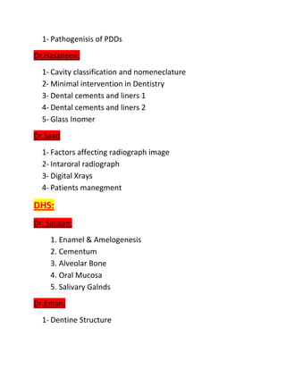 This document contains a list of topics to be covered in final year 2 courses divided among different instructors. It includes topics related to operative dentistry, periodontology, oral pathology, radiology, dental structure and development, biochemistry, behavioral science, head and neck anatomy, and neuroanatomy. The topics cover various body systems, dental specialties, and clinical skills.