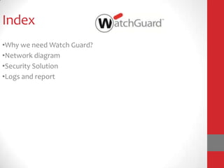 This document proposes a security solution using Watch Guard to provide network security. It summarizes Watch Guard's capabilities such as application control and visibility, intrusion prevention, gateway antivirus, and unified threat management features. The document also compares Watch Guard's features and performance favorably to competitors like Fortinet, Cisco, SonicWall, and Palo Alto Networks.