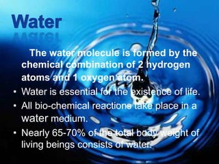 The document discusses the molecular structure of water. It explains that a water molecule is formed by two hydrogen atoms and one oxygen atom bonded together at an angle of 104.5 degrees. The polarity of the water molecule arises from oxygen's higher electronegativity which gives it a partial negative charge and the hydrogen atoms a partial positive charge. This polar nature is an important feature of water and causes it to have unique properties.
