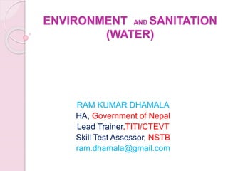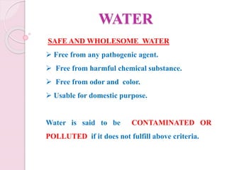 This document discusses water quality and sources. It defines safe and wholesome water as being free from pathogens, harmful chemicals, odor, and color, and able to be used for domestic purposes. It notes the physical demand for water is 2 liters per person per day and domestic usage in urban areas is 150-200 liters per person per day while rural is 40-60 liters. The main sources of water are listed as rain, surface water from reservoirs and rivers, and ground water from shallow and deep wells with sanitary wells being the most ideal.