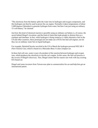 - Dingel demonstrated his "concept car," a modified Toyota Corolla that he says is powered by his hydrogen reactor which splits water using electricity from the car's battery.