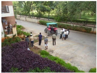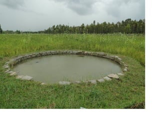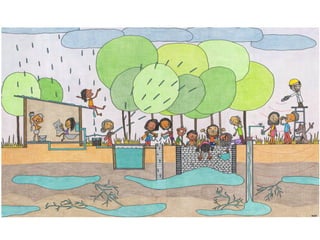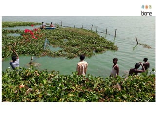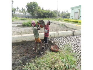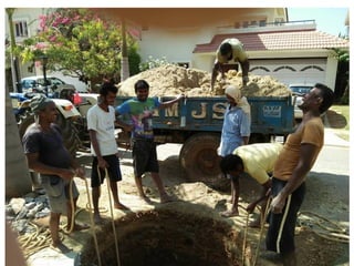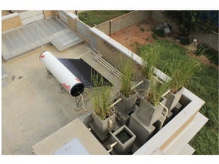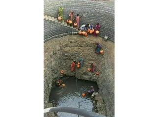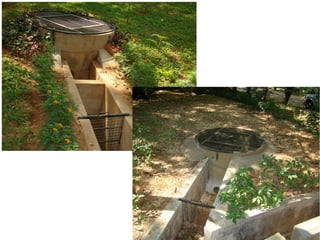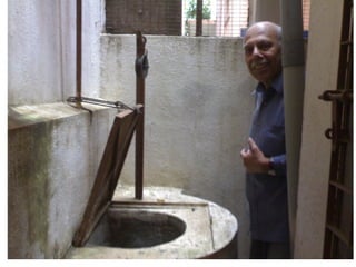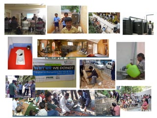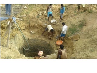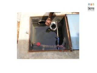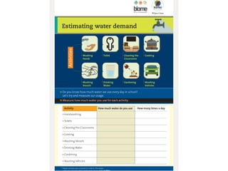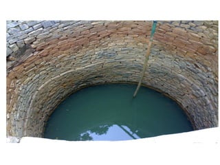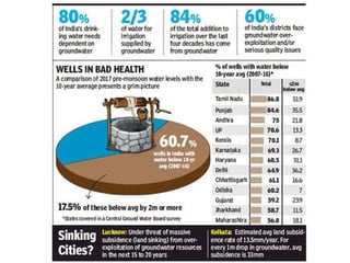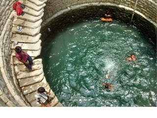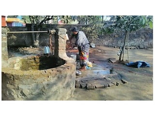 Water is essential for life but cities face challenges in securing adequate supplies. Bangalore gets its water from the Cauvery River 95 km away and 500 meters below the city. Most households get water through taps connected to overhead tanks that are pumped full from underground sumps, but many lack piped connections and rely on tankers or borewells. After use, water is meant to go through sewer systems to treatment plants before reaching lakes, but mixed sewage and stormwater often bypass treatment. Individuals and cities can harvest rainwater and recharge groundwater to help address flooding and scarcity issues.