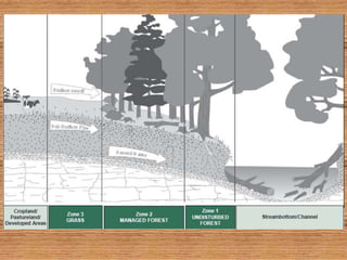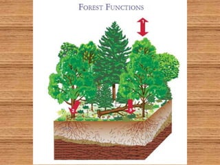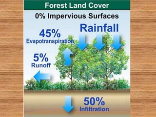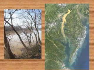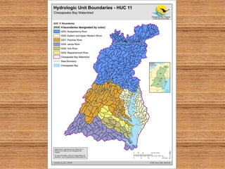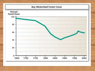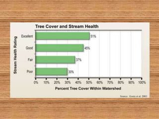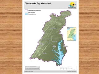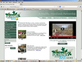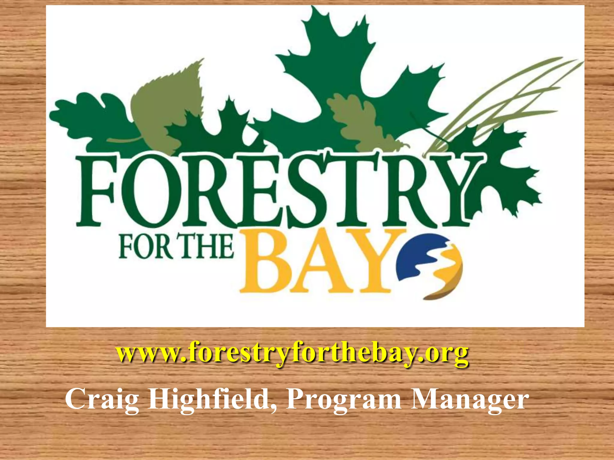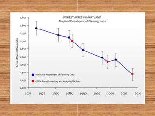 The document discusses how forests help improve water quality in Chesapeake Bay. It notes that 39% of Maryland is forested, totaling over 2.46 million acres, and that forests are the best land cover for enhancing water quality by regulating water temperature, providing habitat and food for fish, and influencing sediment flux. It identifies several issues impacting Maryland forests, such as a decline in forest land area, an increase in even-aged forests from diameter limit cutting, and threats from invasive species and pests. The document provides contact information for Craig Highfield at forestryforthebay.org to learn more about their work improving forest management practices to benefit local waterways.